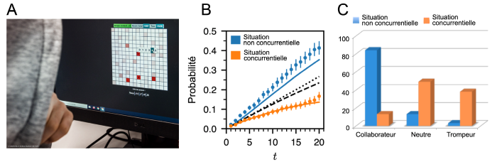 Deux conditions ont été testées pour ce jeu. La première récompensait indifféremment les participants. Ils ont alors adopté un comportement majoritairement collaboratif qui leur permettait de réussir individuellement grâce aux informations contenues dans les traces déposées par le collectif. À l’inverse, dans un environnement concurrentiel, ils ont adopté des comportements majoritairement neutres et trompeurs, en favorisant le partage d’informations peu fiables. Ces travaux publiés dans PNAS le 10 octobre mettent en évidence les conditions qui permettent aux humains de développer de l’intelligence collective.