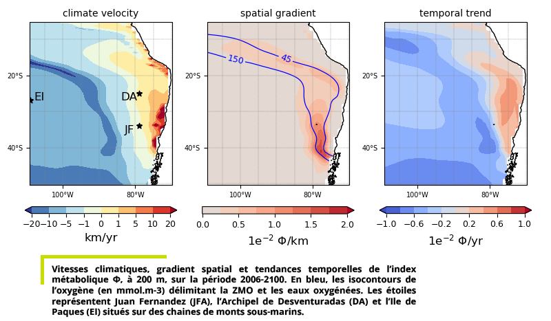 A partir de la projection la plus pessimiste du GIEC, les vitesses climatiques de Φ dans la zone du Pacifique sud-est ont ainsi été calculées jusqu’à la fin du siècle. Le modèle climatique utilisé suggère une réoxygénation de la ZMO qui serait favorable aux espèces habitant les bords de cette zone comme le zooplancton, à la base des chaînes alimentaires marines. En revanche, les zones océaniques les plus à risque couvrent la majorité du Pacifique sud oriental. Elles sont caractérisées pas des tendances temporelles de Φ négatives suggérant une dégradation de l’environnement marin en surface (entre 0 et 200 mètres) en raison du réchauffement, et dans les eaux profondes (au-delà de 400 mètres) à cause de la désoxygénation.