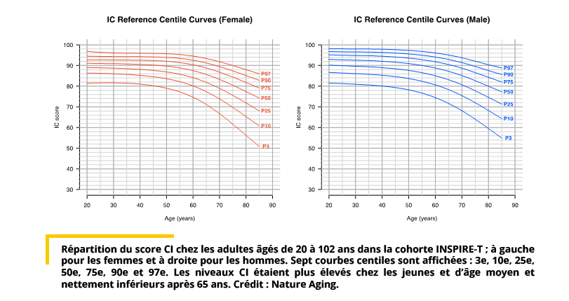 Pour mieux comprendre comment la CI évolue à l'âge adulte et diffère entre les hommes et les femmes, l’équipe de Wan-Hsuan Lu, Philipe de Souto Barreto et Bruno Vellas a utilisé les données de base de 975 adultes de Toulouse et de la région, âgés de 20 à 102 ans, inclus dans une cohorte d’étude INSPIRE sur la longévité en santé de l’IHU HealthAge. Elle a ensuite établi des groupes différents selon l’âge (tranches d’âge de 5 ans) et le sexe des individus. Des centiles de référence permettent de classer la CI de chaque participant sur une courbe de valeurs.