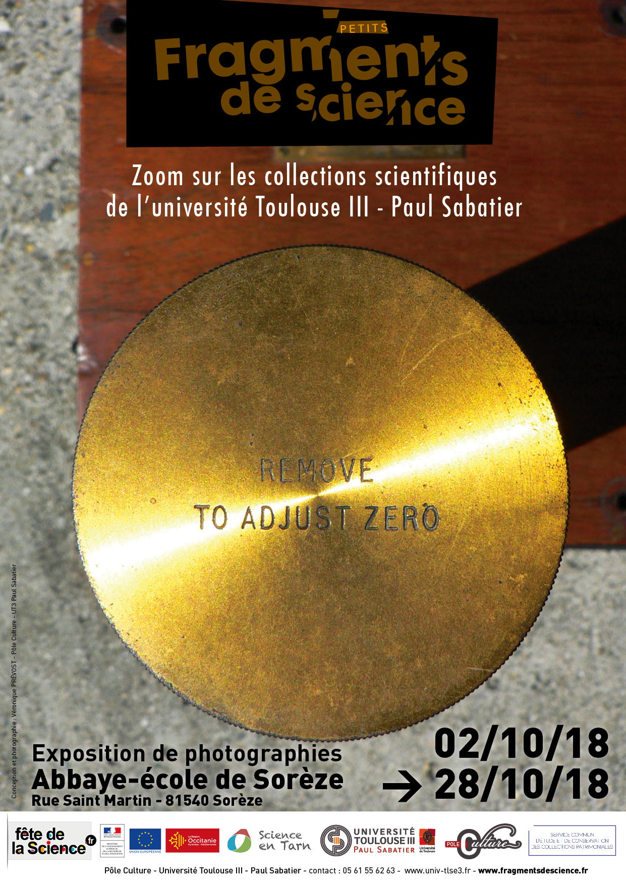 Exposition de photographies Dans le cadre de la Fête de la Science, l'exposition de photographies "Petits Fragments de Science" est accueillie au sein de l'Abbaye-école de Sorèze, dans le Tarn. Cette exposition offre un nouveau regard sur les collections scientifiques patrimoniales de l’université Toulouse III - Paul Sabatier. A travers gros plans et recadrages, le visiteur découvre du bois, du laiton, du verre, des fibres, des signatures, tous ces petits détails qui rendent uniques ces trésors cachés. Plus d'infos