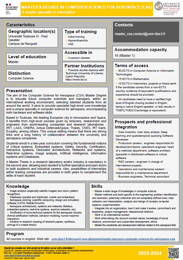 L'objectif du Master Computer Science for Aerospace (CSA) est de former les futurs informaticiens et managers, dans un environnement de travail international, en sélectionnant des étudiants talentueux du monde entier. Il vise à fournir des connaissances fondamentales et spécialisées de haut niveau et une spécialité unique en informatique pour l'aérospatiale, englobant à la fois des compétences matérielles et logicielles. Basée à Toulouse, première ville européenne de l'Aéronautique et de l'Espace, elle bénéficie de formations de haut niveau dispensées par des enseignants-chercheurs, des ingénieurs d'entreprises et de laboratoires de recherche de renommée mondiale : IRIT, LAAS, ONERA, Airbus Defence&Space, Thales, CNES, IRT Saint-Exupéry, entre autres. Ce cadre unique souligne des liens forts et une longue histoire de collaboration entre l'université et les entreprises aérospatiales.
