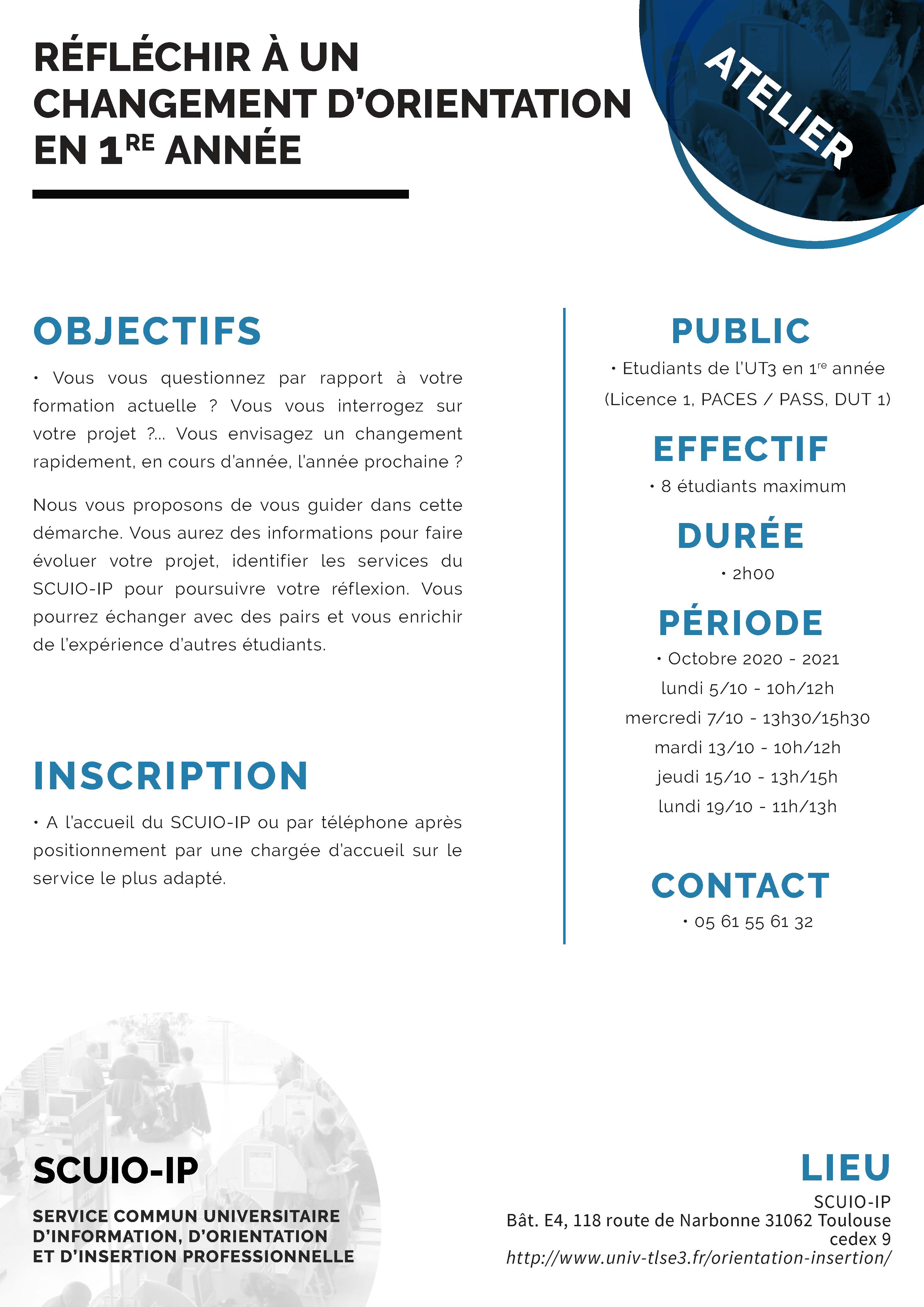 Venez participer à un atelier afin de découvrir les services proposés par le SCUIO-IP pour vous accompagner dans vos projets d'orientation et connaître les différentes possibilités de réorientation, les calendriers et procédures.