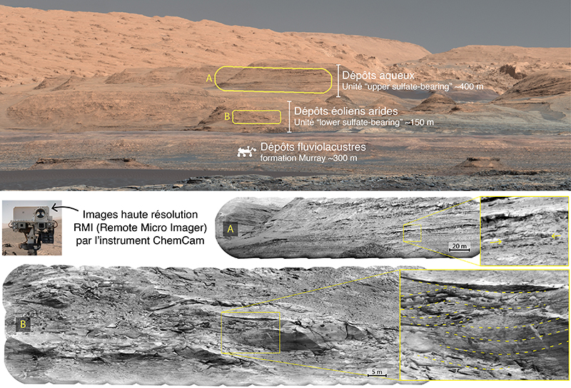 Jusqu’à présent, les sondes en orbite avaient donné des indices de la composition minérale des flancs du mont Sharp mais, depuis la surface, ChemCam a permis d’observer en détail l’organisation des couches sédimentaires, révélant les conditions dans lesquelles elles se sont formées. Et celles-ci changent radicalement sur l’épaisseur du relief exploré (quelques centaines de mètres) : au-dessus des argiles lacustres formant la base du mont Sharp, de larges et hautes structures entrecroisées sont le signe de la migration de dunes façonnées par le vent, lors d’un long épisode climatique sec. Plus haut, une fine architecture de couches alternativement friables et résistantes est typique de dépôts par une plaine d’inondation fluviale : c’est le retour de conditions plus humides. Le climat de Mars a donc vraisemblablement fluctué plusieurs fois à grande échelle entre des conditions sèches et des environnements de lacs et de fleuves, avant l’aridité générale que l’on connait aujourd’hui. Au cours de sa mission étendue, Curiosity devrait gravir les contreforts du mont Sharp pour réaliser des forages dans ces différentes couches. Il pourra tester ce modèle, caractériser avec plus de détails les évolutions climatiques passées, et peut-être comprendre l’origine de ces fluctuations majeures.