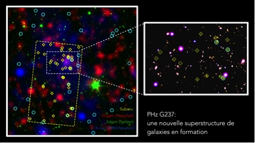 Les proto-amas de galaxies sont des ensembles de galaxies très jeunes en cours de rapprochement sous l’effet de la gravitation, et qui vont donner naissance aux plus grandes structures gravitationnelles connues : des amas de galaxies dans l'univers proche. La compréhension des mécanismes de formation à l’œuvre au sein de ces structures pourrait s’avérer précieuse pour appréhender l’histoire de l’univers. Les résultats des travaux de l’équipe internationale, présentés dans deux articles, fournissent ainsi des informations essentielles sur les propriétés de ce proto-amas baptisé PHz G237.01+42.50 (ou G237 en abrégé) et des galaxies qui le composent.